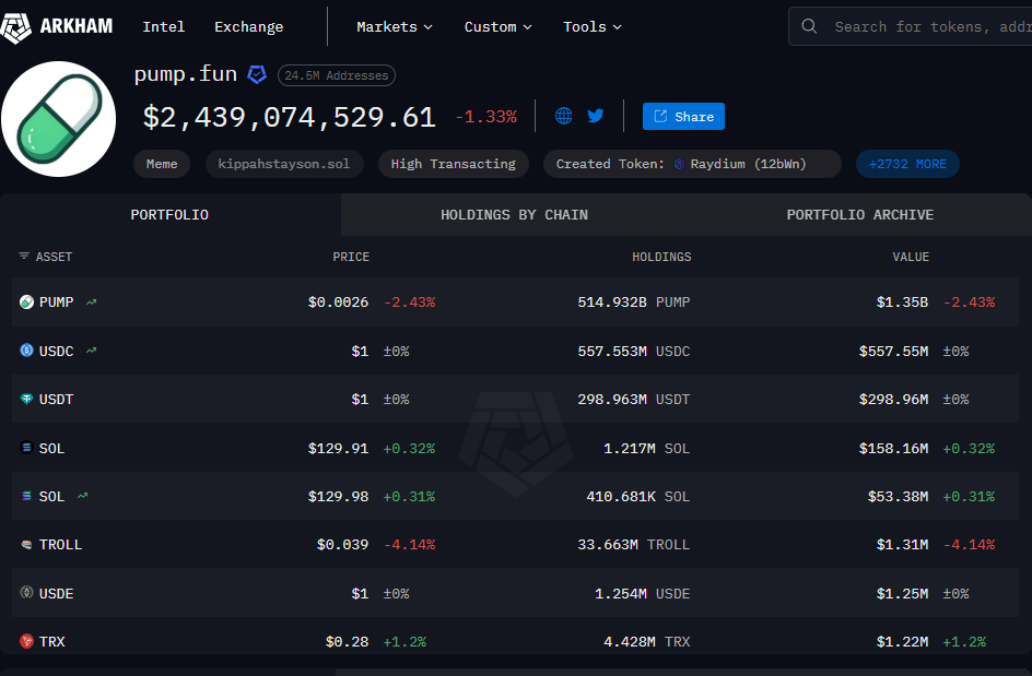 Pump.fun cüzdan adresi, varlıklar. Kaynak: Arkham